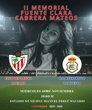 0-5 acabó el II Memorial Fuente Clara Cabrera Mateos entre el Rociana y el Recreativo de Huelva. El encuentro comenzó con un disparo en la frontal en el primer minuto de Évora que detuvo el exrecreativista Roberto Rosa. Siguió un centro de Dani Romero que remató desviado en el área Dani Romero (7'). Évora adelantó al Decano al empujar en boca de gol un centro de Dani Romero (11').