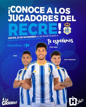 El Recreativo de Huelva protagonizará este jueves una acción promocional en la que tres jugadores del primer equipo —Pepe Mena, Roni y Álex Carrasco— se darán un baño de masas con los aficionados. El evento tendrá lugar el 20 de noviembre a las 16:25 horas en la Plaza H de Carrefour, en un acto reservado exclusivamente para los socios de El Club Carrefour.