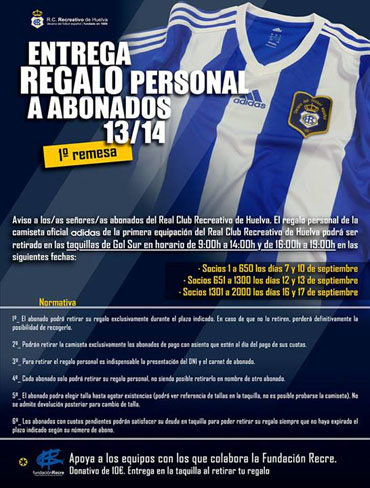 El Recreativo de Huelva ha comunicado hoy la normativa referente a la recogida de las camisetas con las que se incentivaba a los abonados esta temporada. La primera remesa se repartirá por orden de antigüedad. Así, los abonados con el número 1 al 650 deberán pasar por la taquilla de gol sur los días 7 y 10 de septiembre, los del 651 al 1300 los días 12 y 13 y los que tengan el número del 1301 al 2000 los días 16 y 17 de septiembre. El horario de taquilla es de 9:00 a 14:00 y de 16:00 a 19:00.