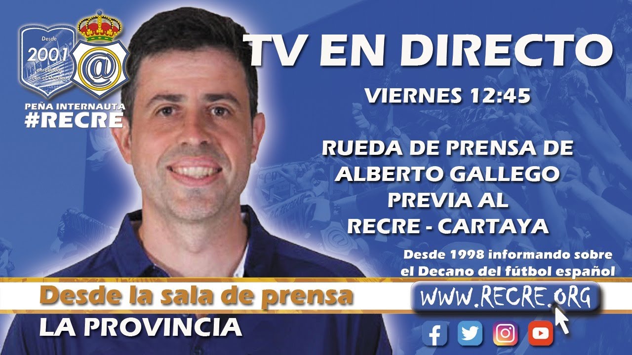 El entrenador del Recreativo de Huelva, Alberto Gallego, declaró en la rueda de prensa previa al encuentro ante la A.D. Cartaya que "las circunstancias de este tramo final, ese deseo de conseguir el ascenso cuando tienes la posibilidad, hemos tenido que hacer un trabajo anímico importante, de entender que hay que tener paciencia, hacer buenos partidos, todo llegará y hacer las cosas como veníamos haciendo. El nivel anímico ha ido de menos a más, tenemos mucha ilusión, muchas ganas del partido, hoy ha sido un entreno fantástico y con muchas ganas del partido".