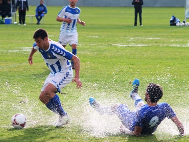 Dadas las circunstancias, era más un partido de Water Polo que de fútbol. La primera ocasión real de peligro no llegó hasta el minuto 34 con un centro-chut de Caye Quintana que no llegó a rematar José Naranjo. Contestaron los visitantes siete minutos más tarde con una falta que acabó con un disparo de Jorge Vázquez al larguero y cuyo rechace lo cazó Melo en la frontal y acabó parándolo Rubén con una soberbia actuación que levantó los aplausos del medio centenar de espectadores que poblaban las gradas de la ciudad deportiva.