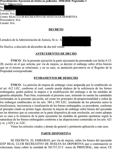 Las caras de preocupación de las últimas fechas de los dirigentes del Recreativo de Huelva no es casualidad. A la sentencia desfavorable, aunque recurrible aún, sobre Pablo Comas, se ha unido uno de los muchos embargos que en el pasado reciente está recibiendo la entidad.