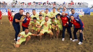 Primera jornada y primera victoria de la selección española de fútbol playa en la superfinal de la EBSL, con los dos jugadores del Recreativo de Huelva de Fútbol Playa, Javi Camacho y Brian Hernández, titulares en el quinteto inicial. Brian Hernández, de libre directo en el minuto 6 y de chilena en el minuto 15, hizo dos de los siete tantos del combinado español.